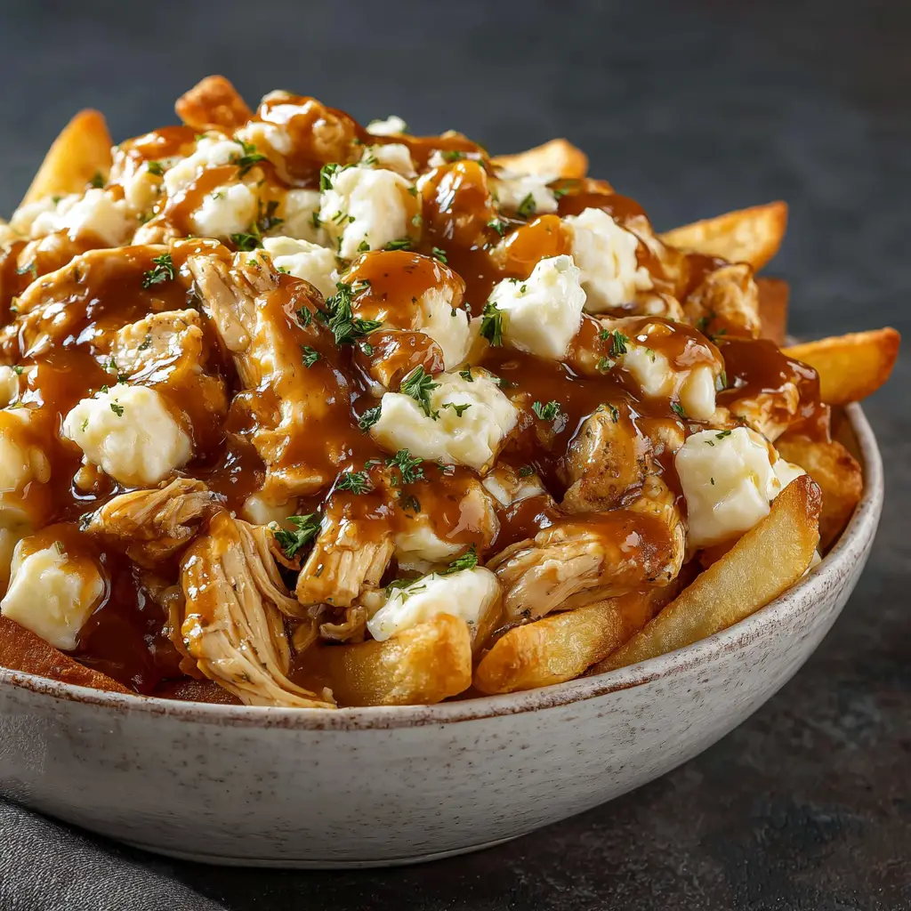 This is the final, glorious step! Place a generous portion of hot, crispy fries on a serving plate or in a bowl. Sprinkle a handful of cheese curds over the fries. Top with a good amount of the shredded chicken. Finally, ladle the hot, rich gravy all over everything. The heat from the fries and gravy will slightly melt the cheese curds, making them perfectly soft and squeaky. Garnish with fresh parsley or chives and serve immediately.