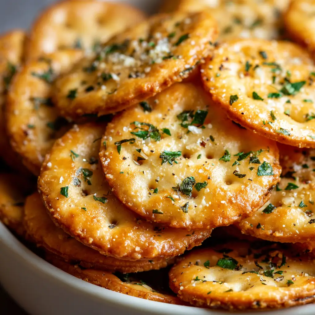 A macro photograph showing a pile of golden brown, seasoned Ritz crackers. The crackers are glistening with garlic butter and herbs.