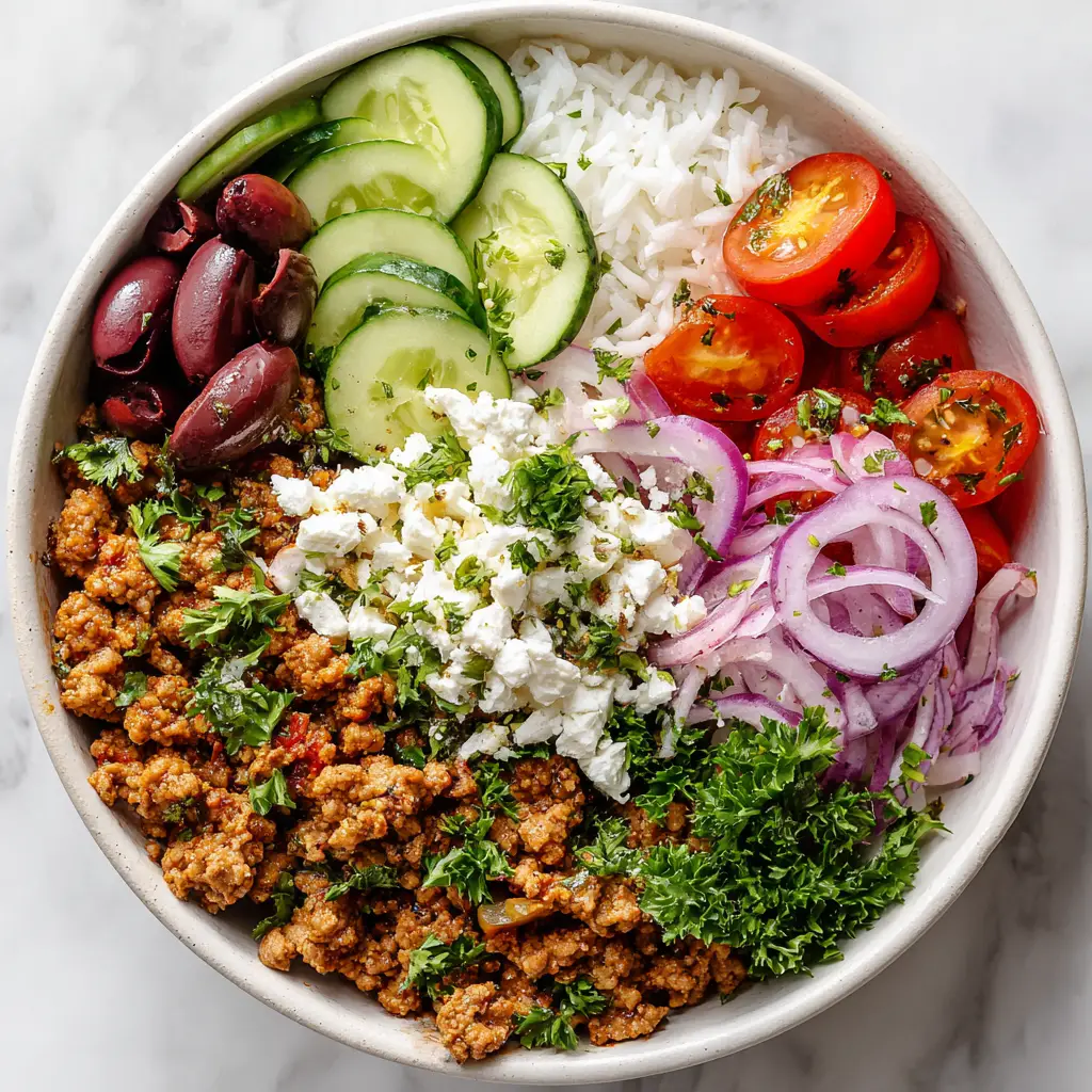 - To assemble the bowls, divide the cooked rice evenly among four bowls. Top with a portion of the seasoned ground turkey. Arrange the cherry tomatoes, diced cucumber, red onion, and kalamata olives on top.
