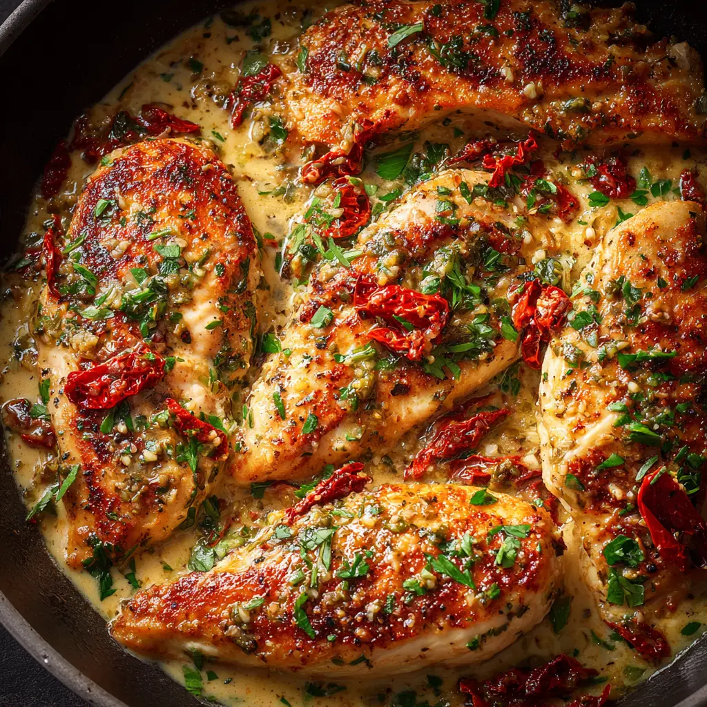 A close-up overhead shot of golden-brown chicken breast simmering in a creamy sun-dried tomato sauce.