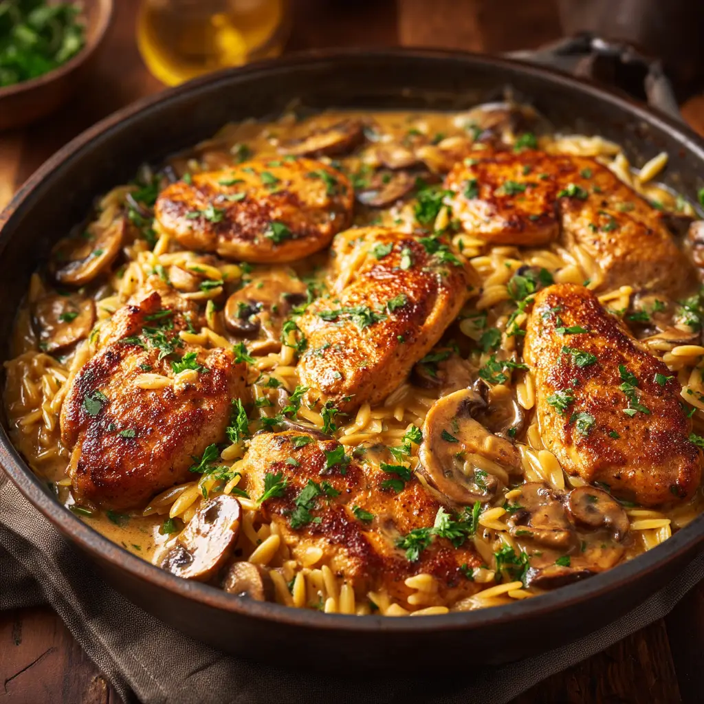 - Return the golden-brown chicken and any resting juices to the skillet, nestling them into the creamy orzo and mushrooms. Simmer for 2 minutes to warm through. Remove from heat, garnish with chopped parsley, and serve.
