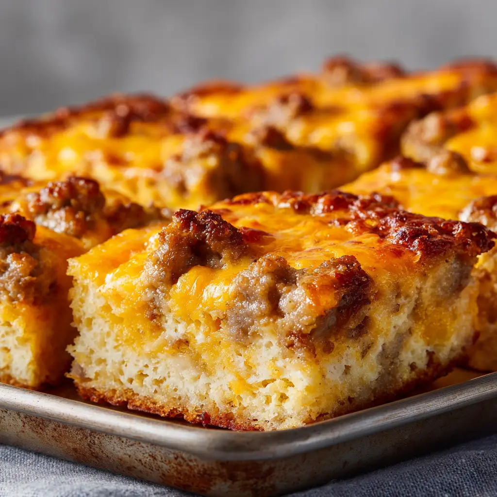 This isn’t just any pancake; it’s a culinary masterpiece embedded with savory, browned crumbled breakfast sausage and draped in a blanket of gooey, melted bright orange cheddar cheese. Each square slice offers fluffy, cloud-like interiors and delightfully crispy, browned edges, just like you see in that perfect, unedited smartphone photo. It’s the breakfast you’ve been dreaming of, served straight from a dark metal baking sheet.